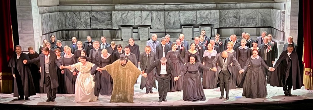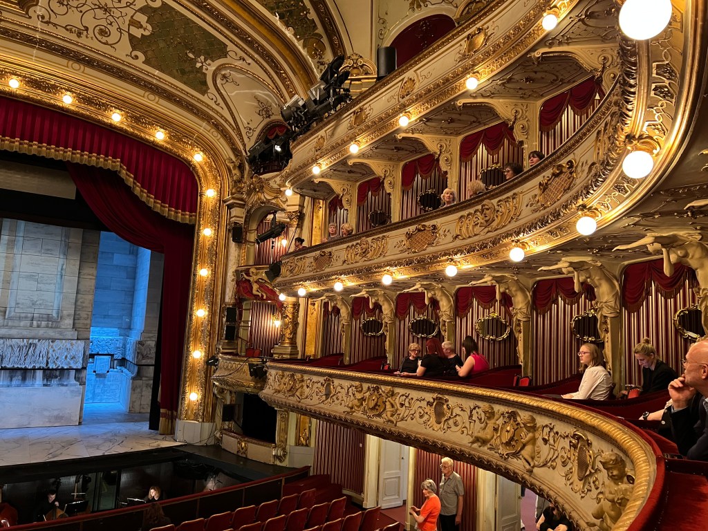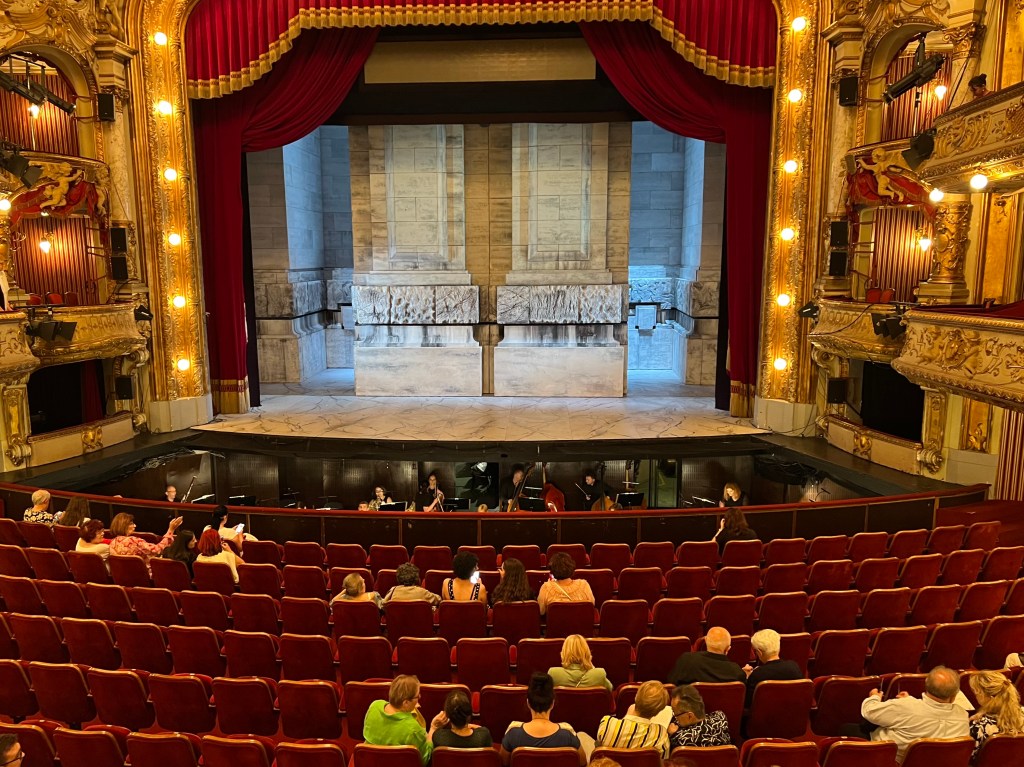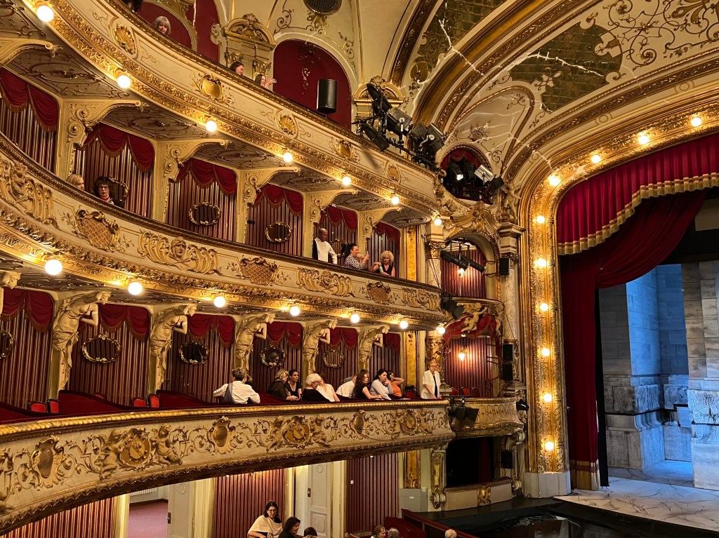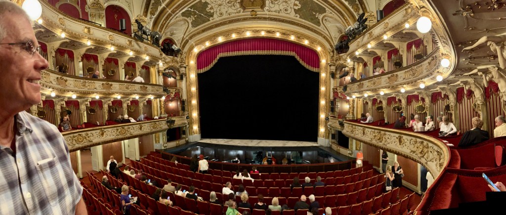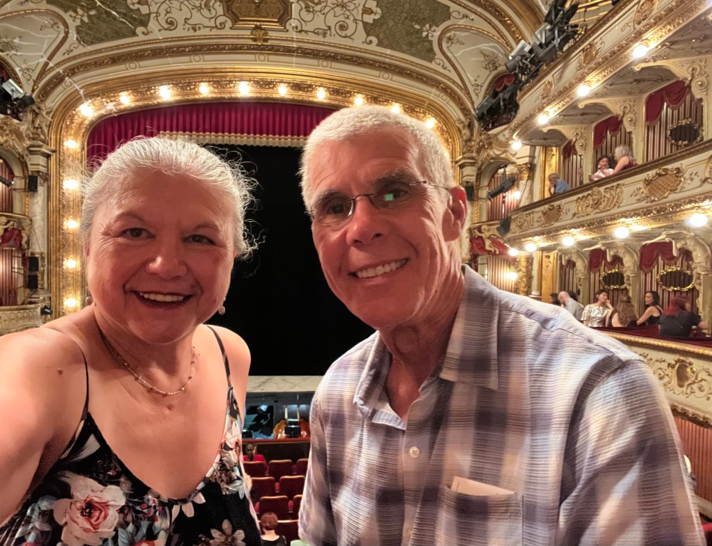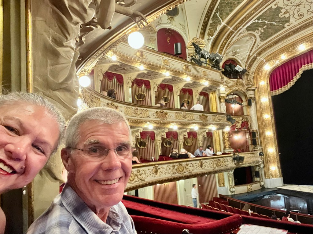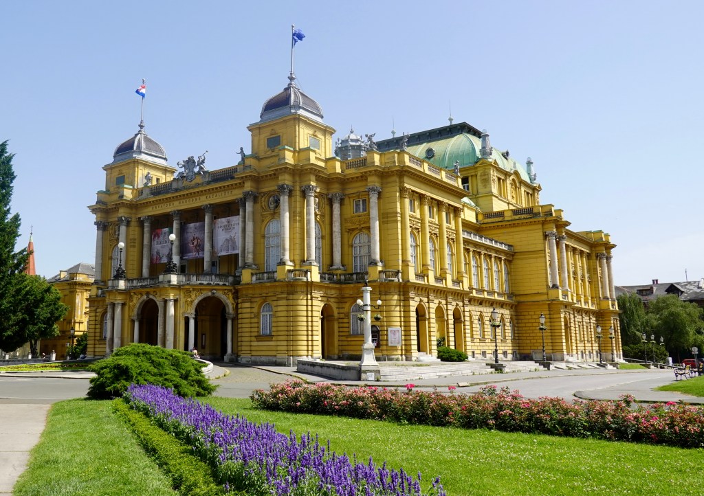 After breakfast, we packed up and headed out. We knew we were Europe for sure when all the churches we wanted to see were covered in scaffolding….We walked till we dropped in the 39C/102F temperature. We took a break in a little cafe that had a mister then off we went till we came across a beautiful yellow building that turned out to be the Croatian National Theatre. We wandered in and discovered they had tickets available for that night’s opera. Of course had to buy them as they were the best seats in the house, well actually, the second best as the box right above us is apparently where the President would sit when he comes to the opera. We shared our box with a wonderful couple, Ruzica and Robert. She spoke no English but way more than I spoke Croatian, nonetheless, we got on just the same. Her husband, Robert, spoke really good English which he said he learned when he drove a cab!