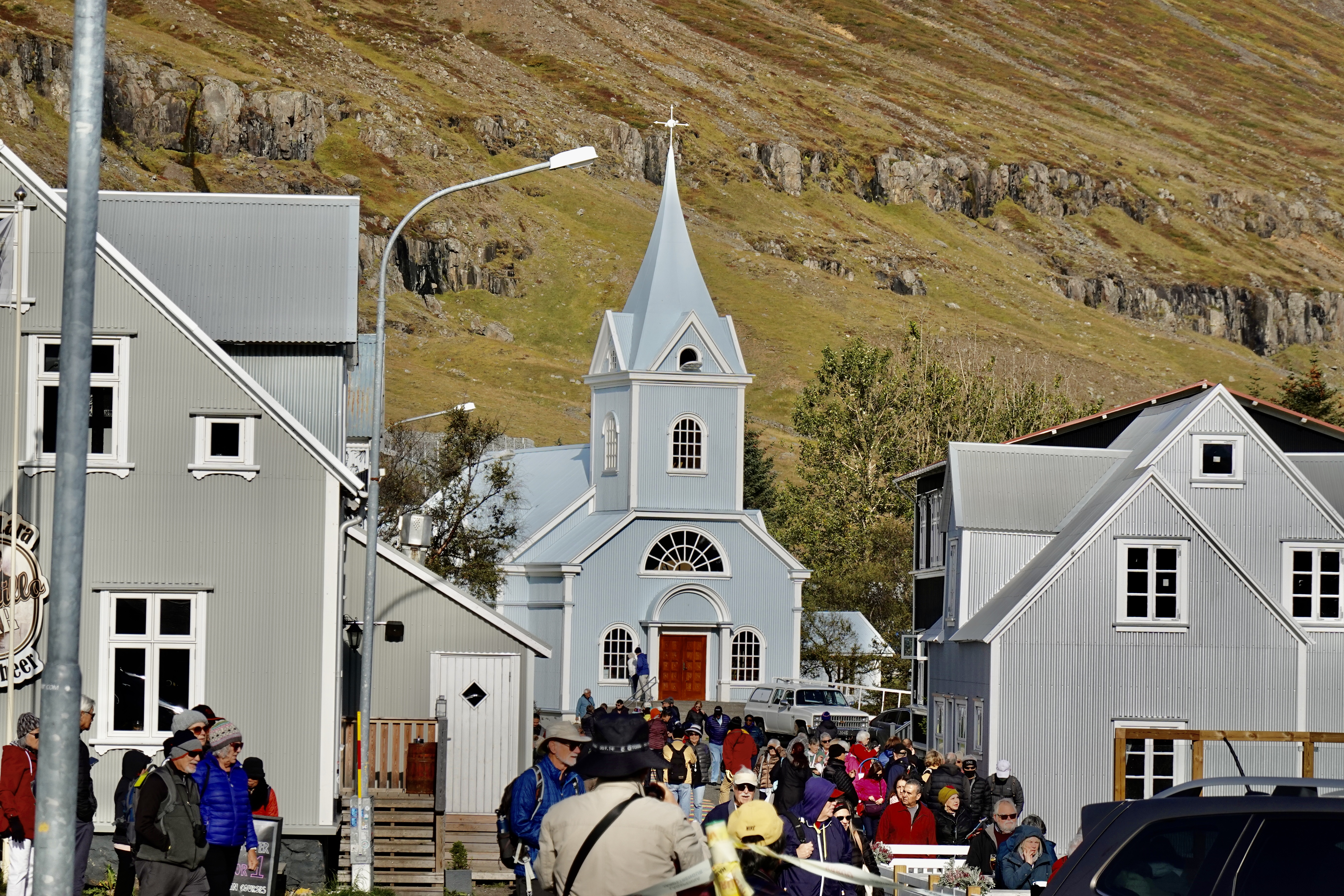 We walked to the beautiful old wooden church often called the “Blue Church” but we could not go in as they were having a funeral service.