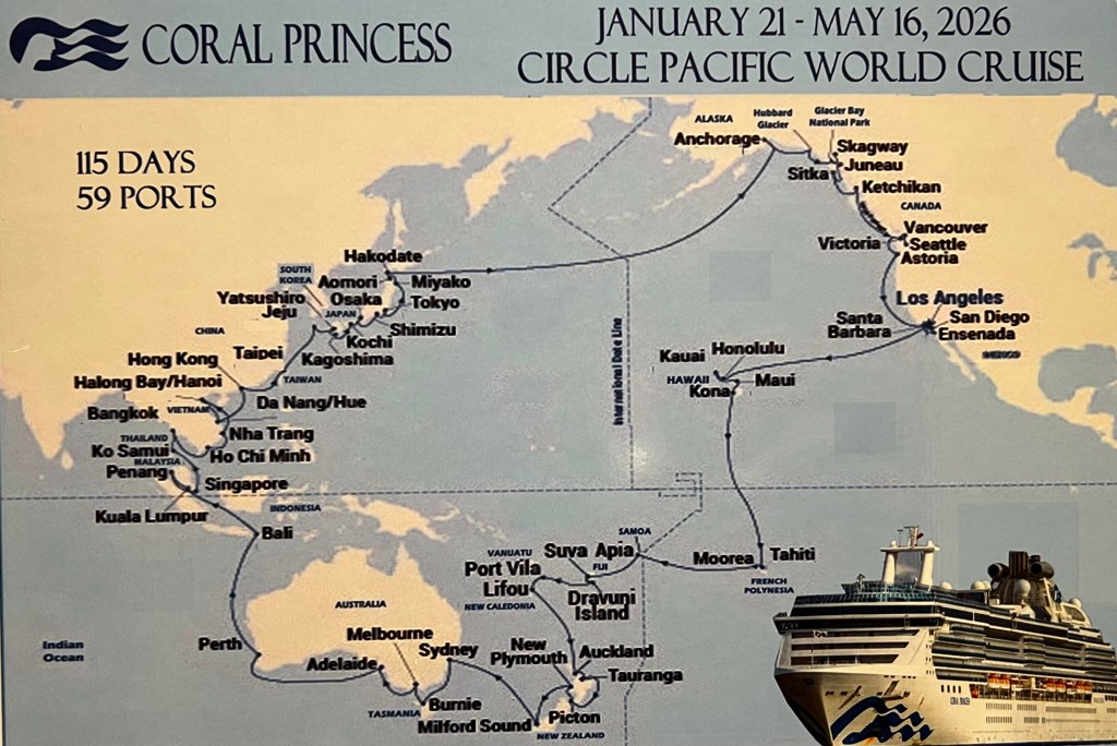 The full itinerary begins with five long sea days from Los Angeles to Honolulu. We decided to trade that stretch of open ocean for a simple five‑hour flight instead — a choice that gave us more time on land and a gentler start to the journey. It felt like the right kind of shortcut.