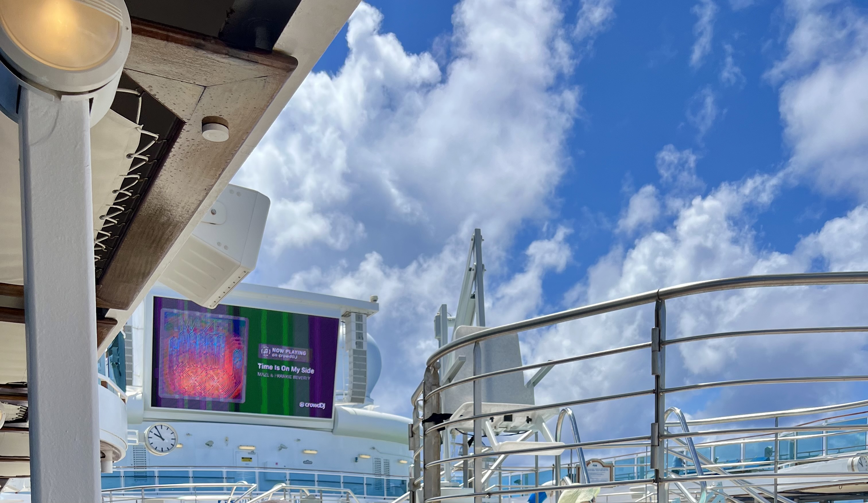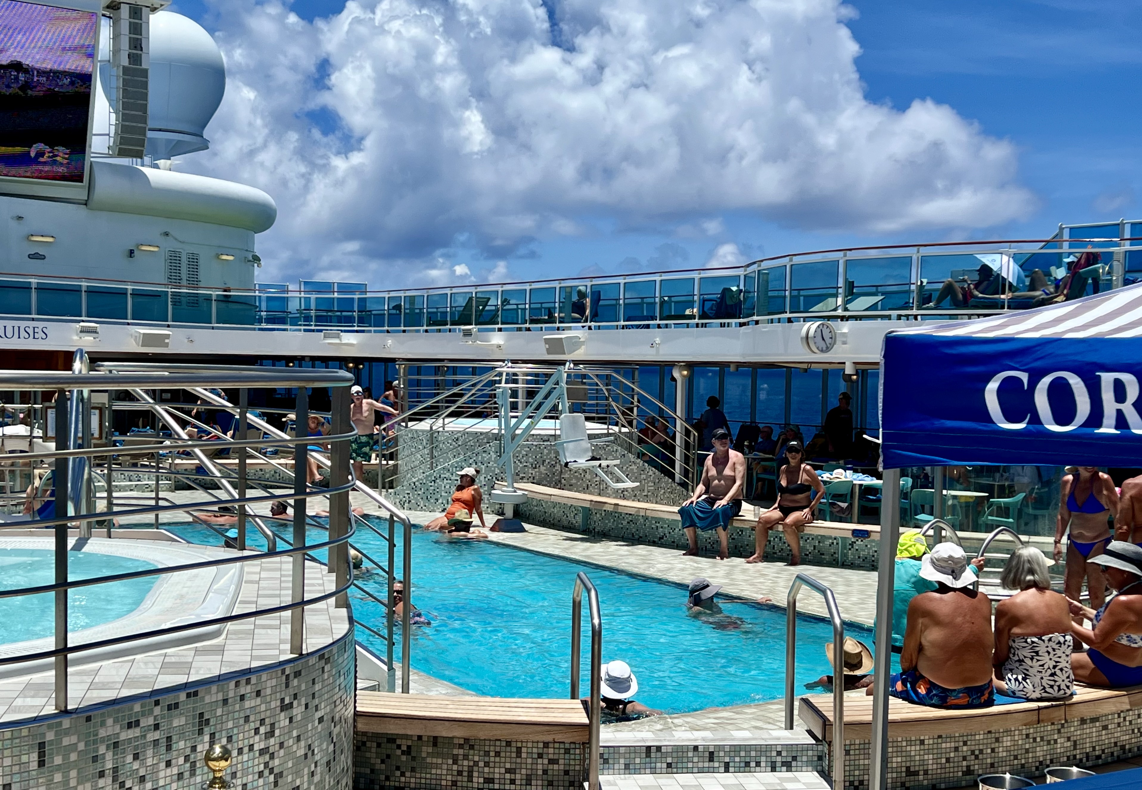 Our first full day at sea happened to land on Super Bowl Sunday, and the ship treated it like a holiday. By mid‑morning, the Lido Deck had transformed into a floating stadium — lounge chairs lined up like bleachers, the giant screen glowing over the pool, and passengers settling in with the kind of anticipation usually reserved for sail‑away parties.
