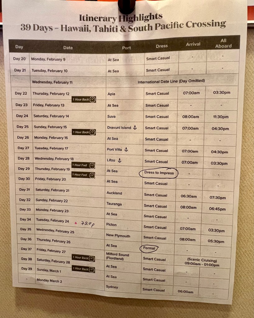 With French Polynesia behind us, we now head into another stretch of sea days — officially four, though it will magically become three once we cross the International Date Line. There’s something wonderfully strange about going to bed on one date and waking up having skipped an entire day, as if the ocean itself decided to fast‑forward time for us. It adds a little spark of fun to the journey ahead, a reminder that out here, time bends and the adventure keeps unfolding in its own rhythm.