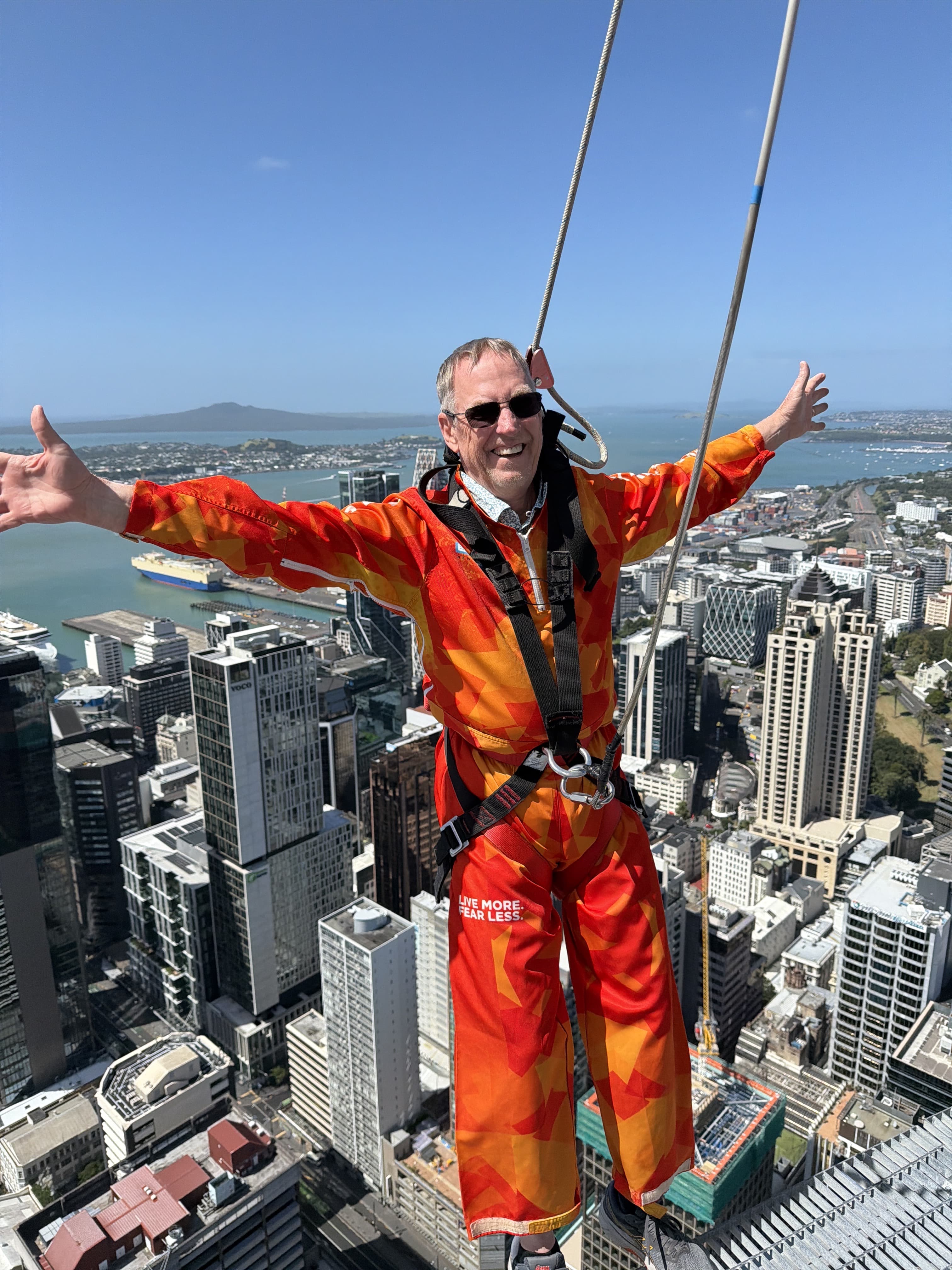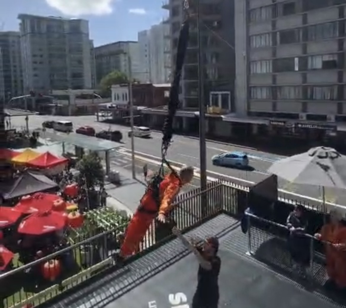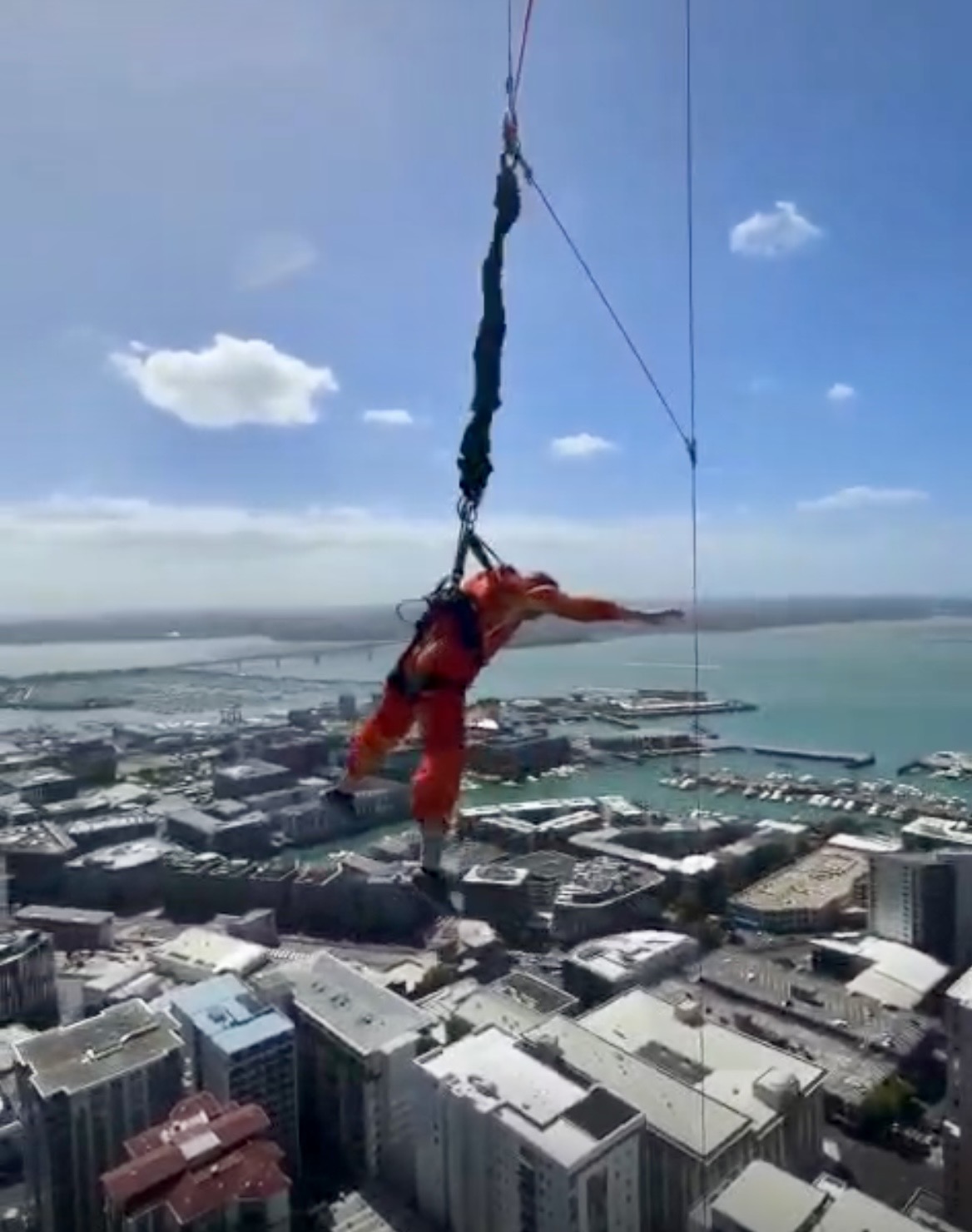 There goes Andy — committed, airborne, and all in as he sails down the Sky Tower!