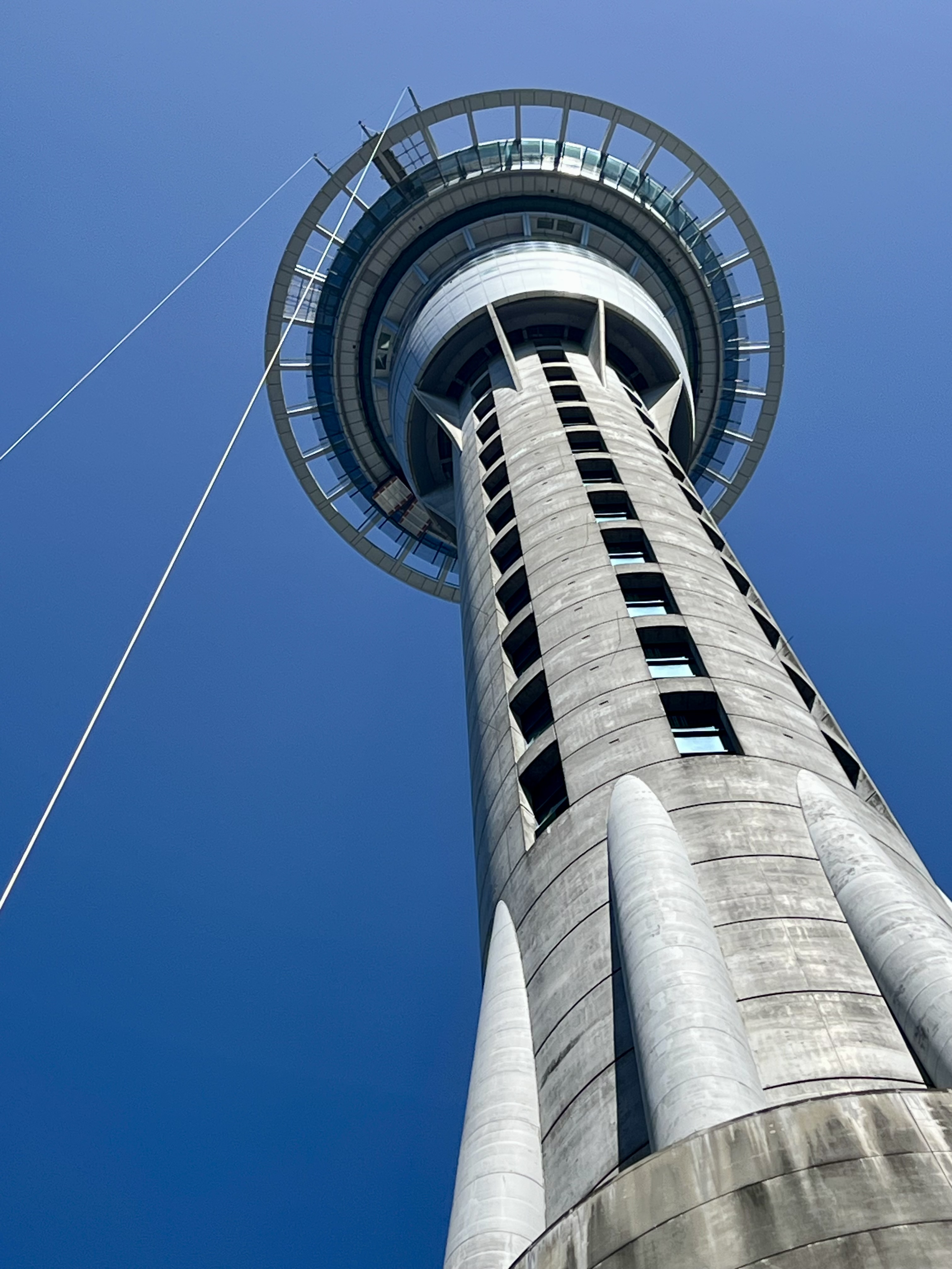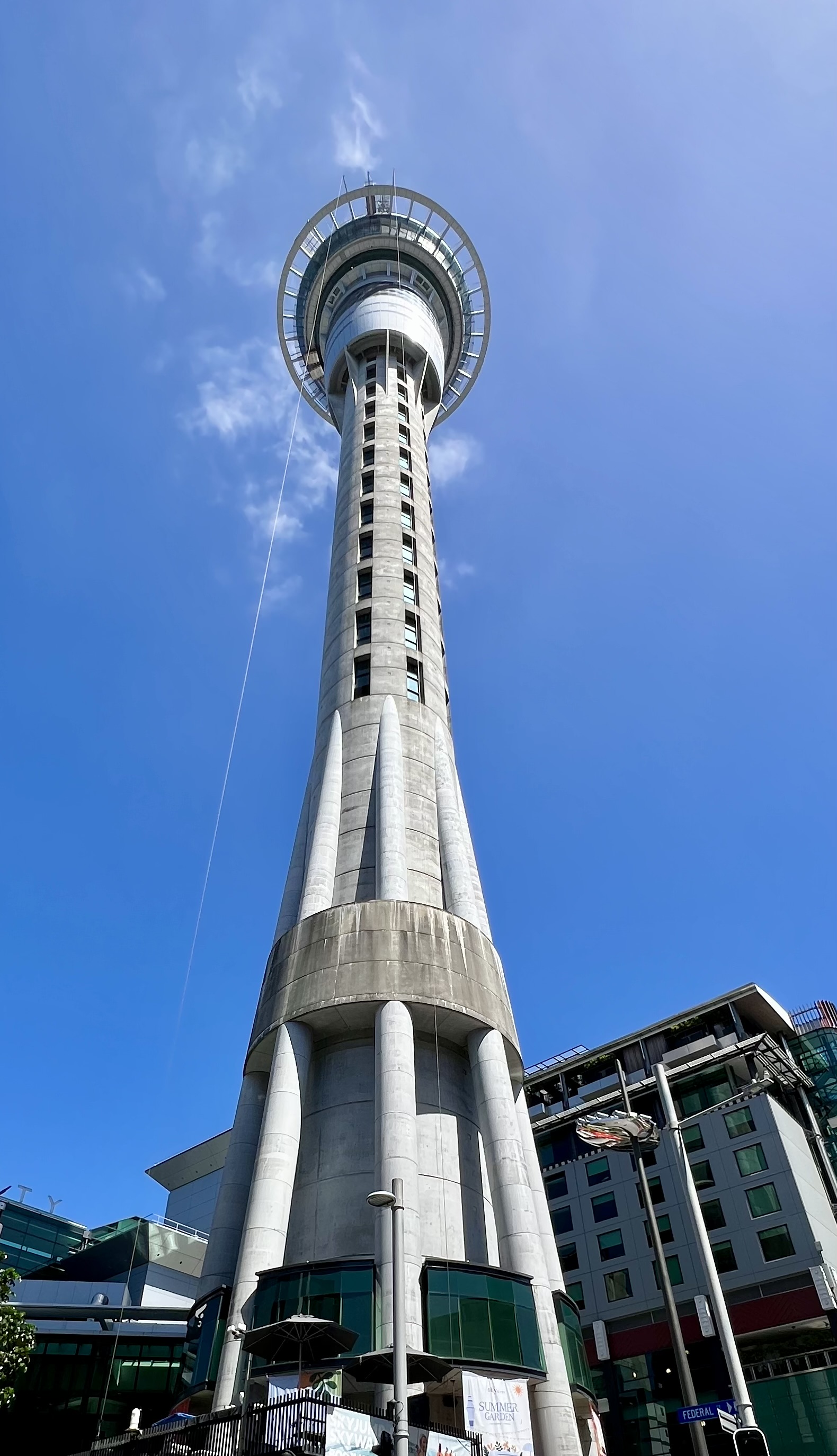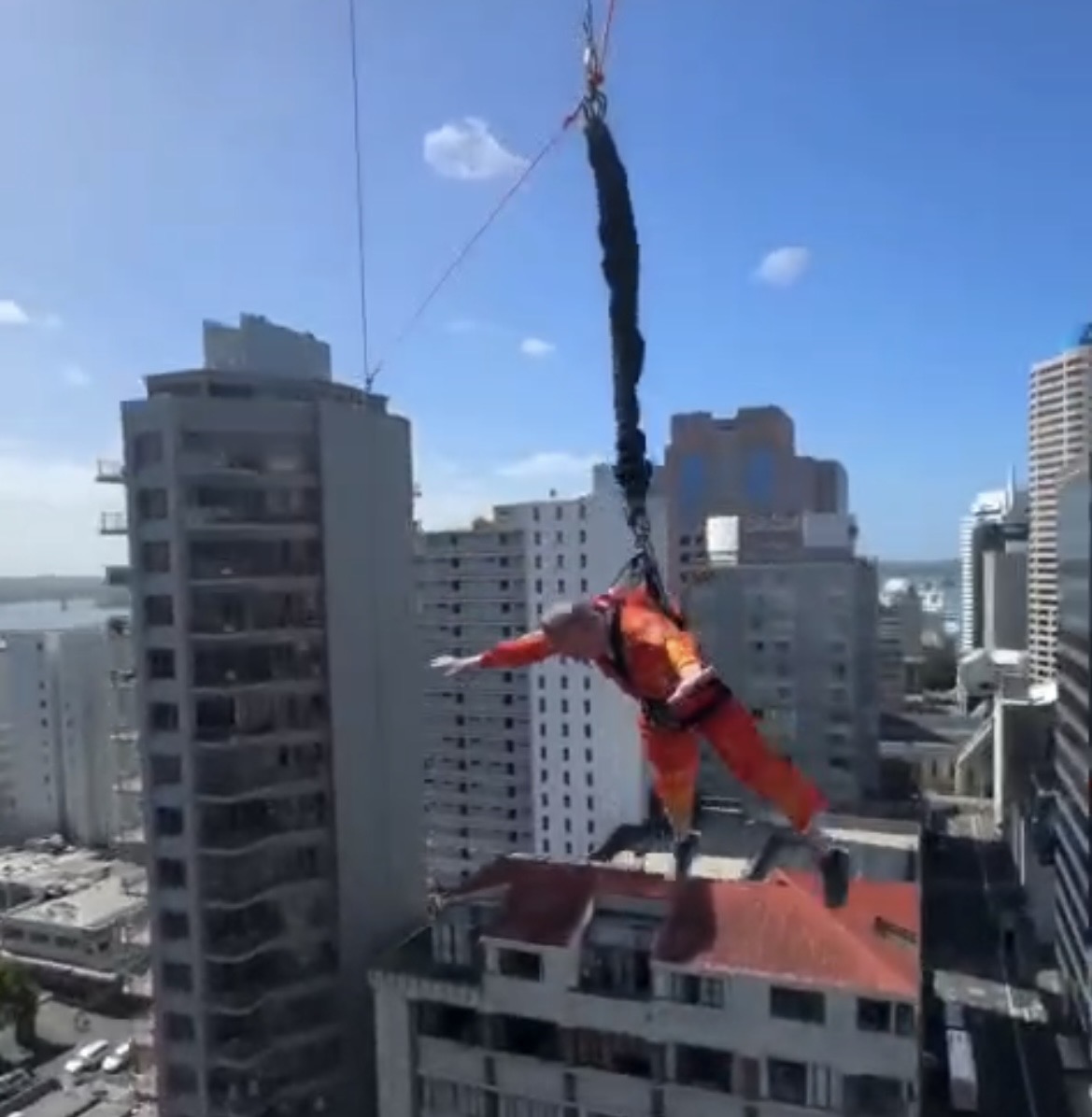 There goes Andy — committed, airborne, and all in as he sails down the Sky Tower!
