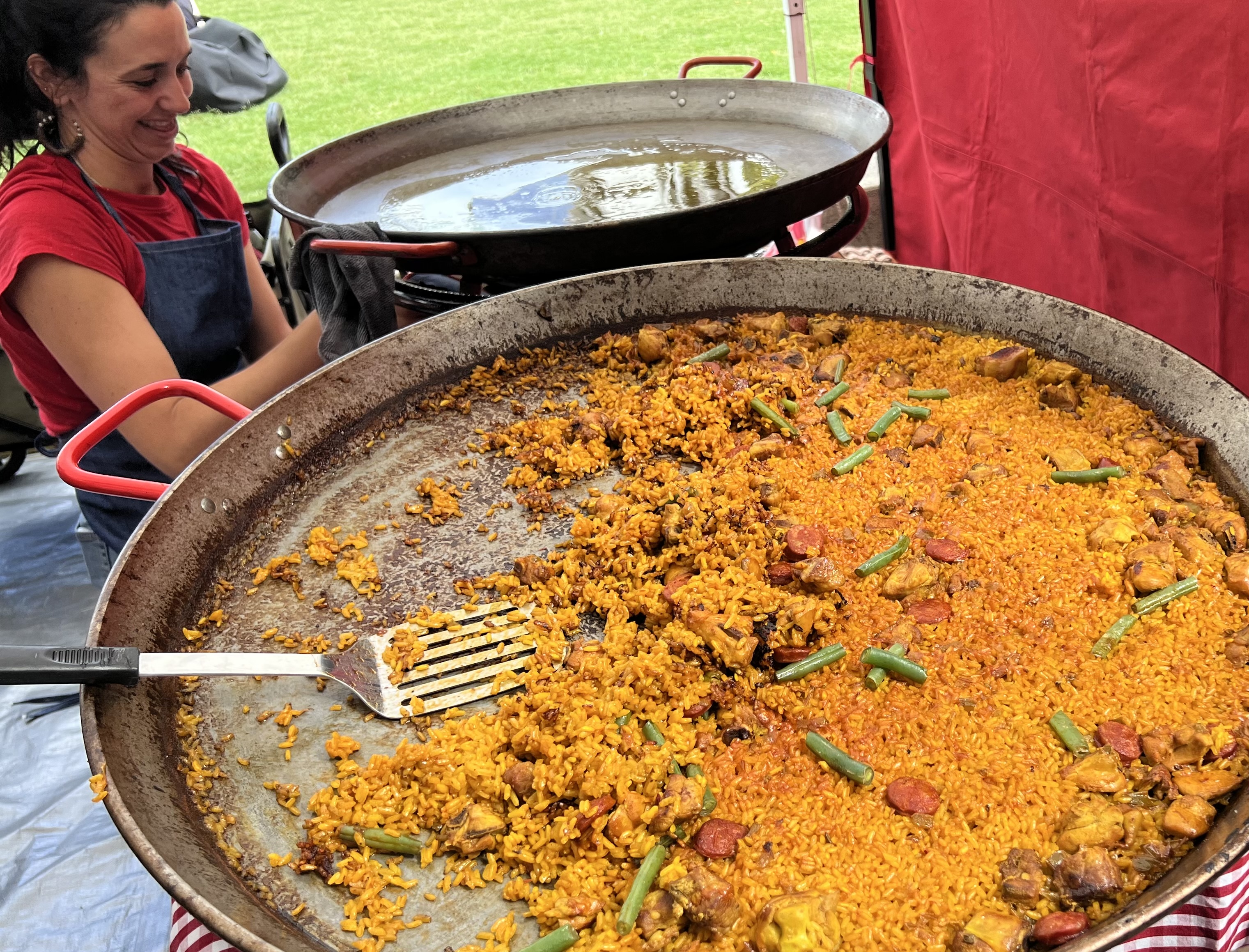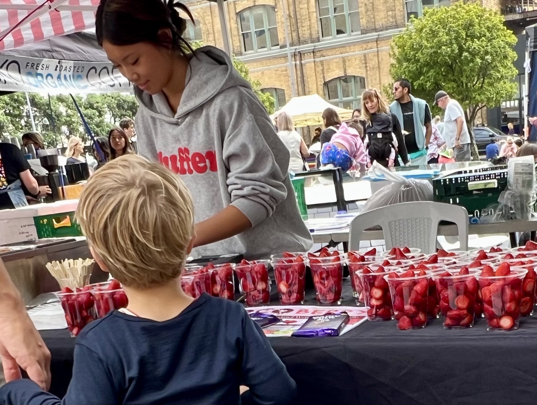 We drifted through downtown until the smell of spices and grilled food pulled us into a farmers market tucked between the buildings. It felt like the whole world was cooking at once: dumplings steaming beside fresh pastries, skewers sizzling next to trays of sweets, every aroma trying to outdo the last. People wandered with coffees, kids tugged at parents for treats, and the whole place buzzed with that relaxed, weekend energy.