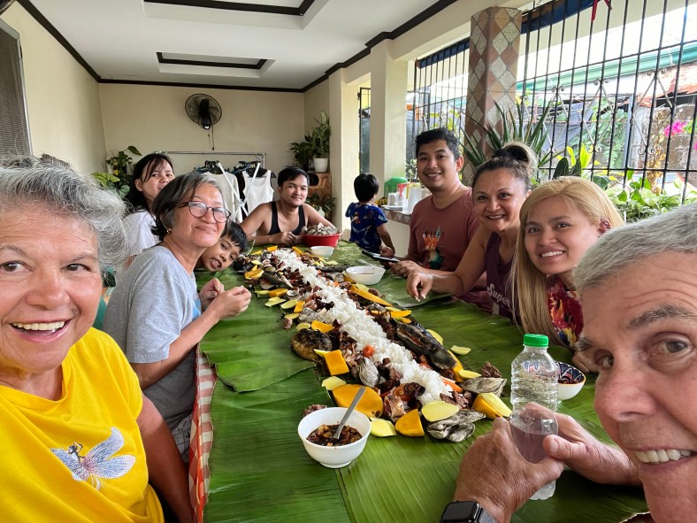 Of course, meals at home were just as memorable as the reunions. We gathered around generous spreads, and one evening we shared a traditional kamayan—a meal eaten with our hands, laid out on banana leaves. Locals also call it a boodle fight, a feast where everyone digs in together. It was joyful, messy, and delicious.